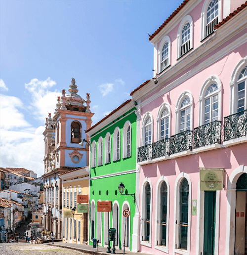O Pelourinho é um espetáculo para os olhos e um dos cenários mais icônicos do Brasil. Suas ladeiras de paralelepípedos levam o visitante a um passeio encantador por ruas que parecem obras de arte a céu aberto. Os casarões coloniais, erguidos entre os séculos XVII e XVIII, estão hoje pintados em tons vibrantes de azul, amarelo, rosa, verde e lilás, criando um mosaico de cores que se tornou marca registrada do bairro.